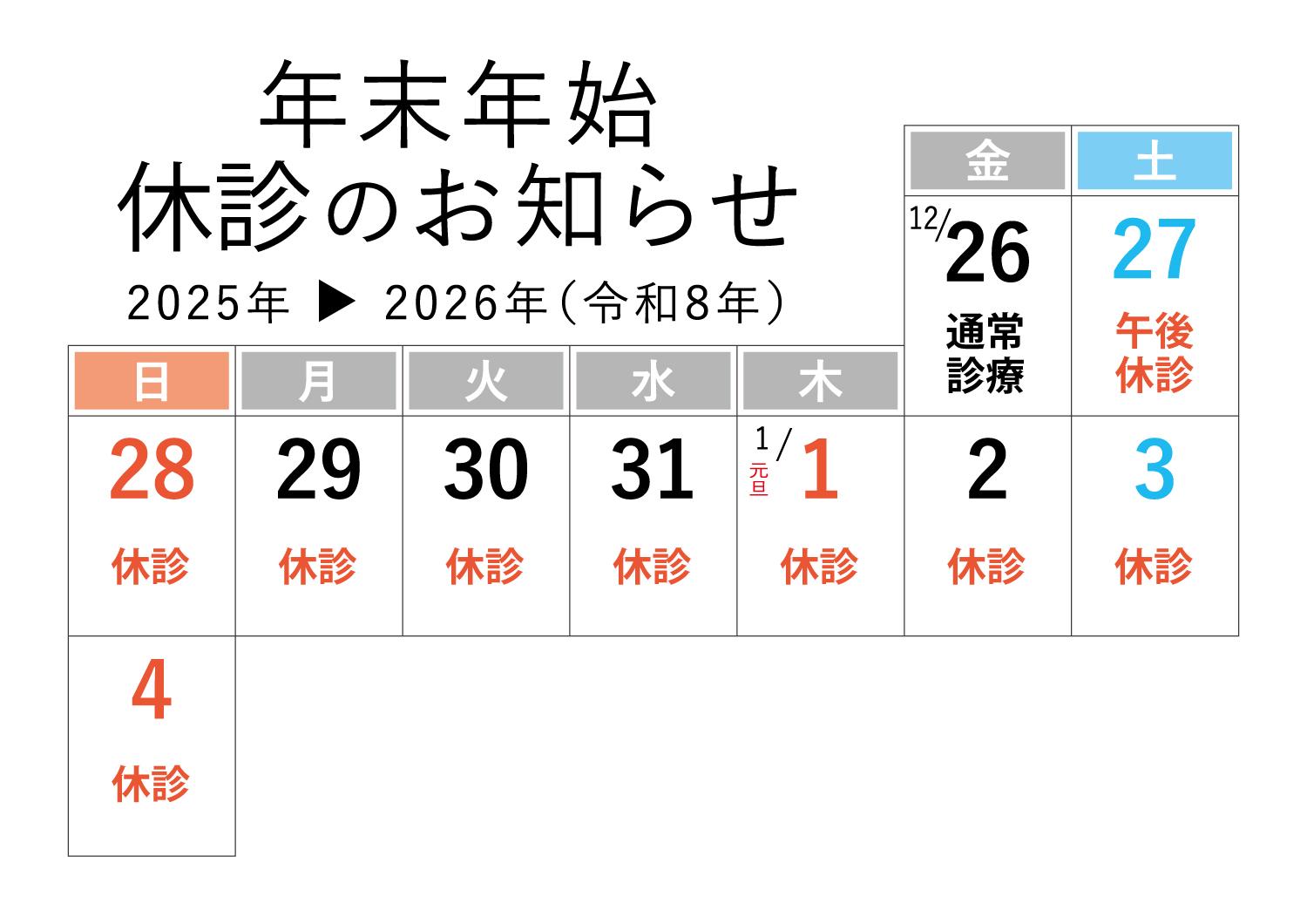 2025-2026 年末年始休診のお知らせ